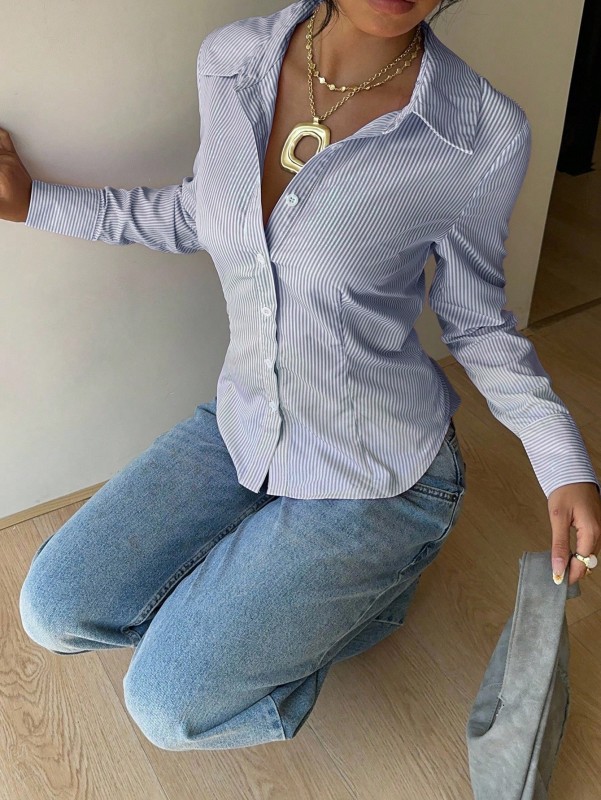 Women's Autumn New Pink Striped Tie-Waist Slim Fit Long Sleeve Shirt